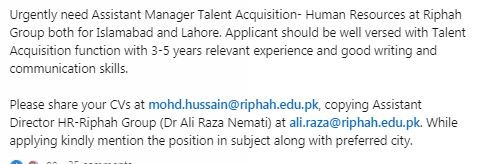 Urgently need Assistant Manager Talent Acquisition- Human Resources at Riphah Group both for Islamabad and Lahore. Applicant should be well versed with Talent Acquisition function with 3-5 years relevant experience and good writing and communication skills.
