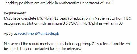 Apply at recruitment@umt.edu.pk