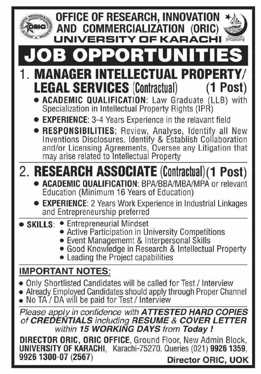 Please apply in confidence with ATTESTED HARD COPIES of CREDENTIALS including RESUME & COVER LETTER within 15 WORKING DAYS from Today I DIRECTOR ORIC, URIC OFFICE, Ground Floor, New Admin Block. UNIVERSITY OF KARACHI, Karachi-75270. Queries (021) 9926 1359. 9926 1300-07 (2567) Director ORIC, UOK