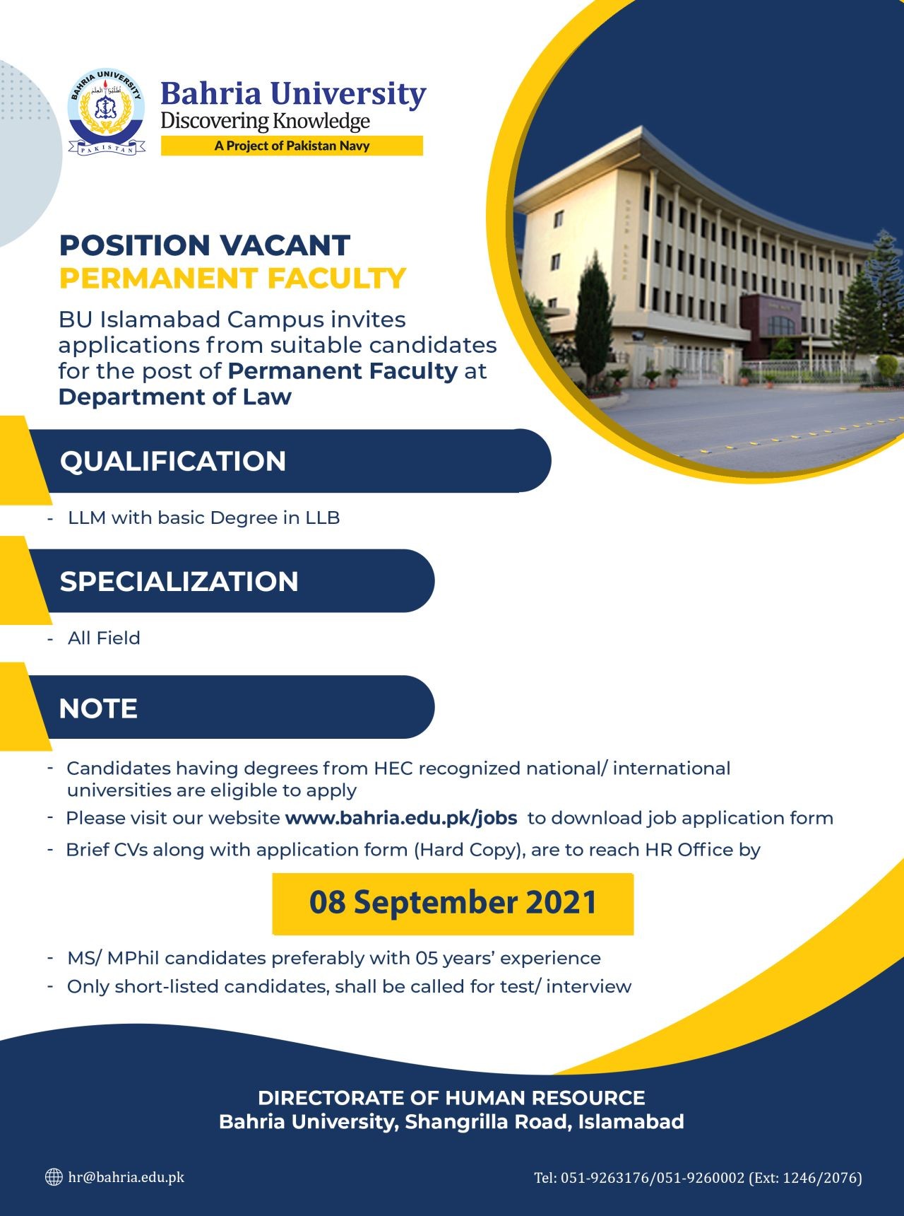 Candidates having degrees from HEC recognized national/ international universities are eligible to apply - Please visit our website www.bahria.edu.pk/jobs to download job application form - Brief CVs along with application form (Hard Copy), are to reach HR Office by