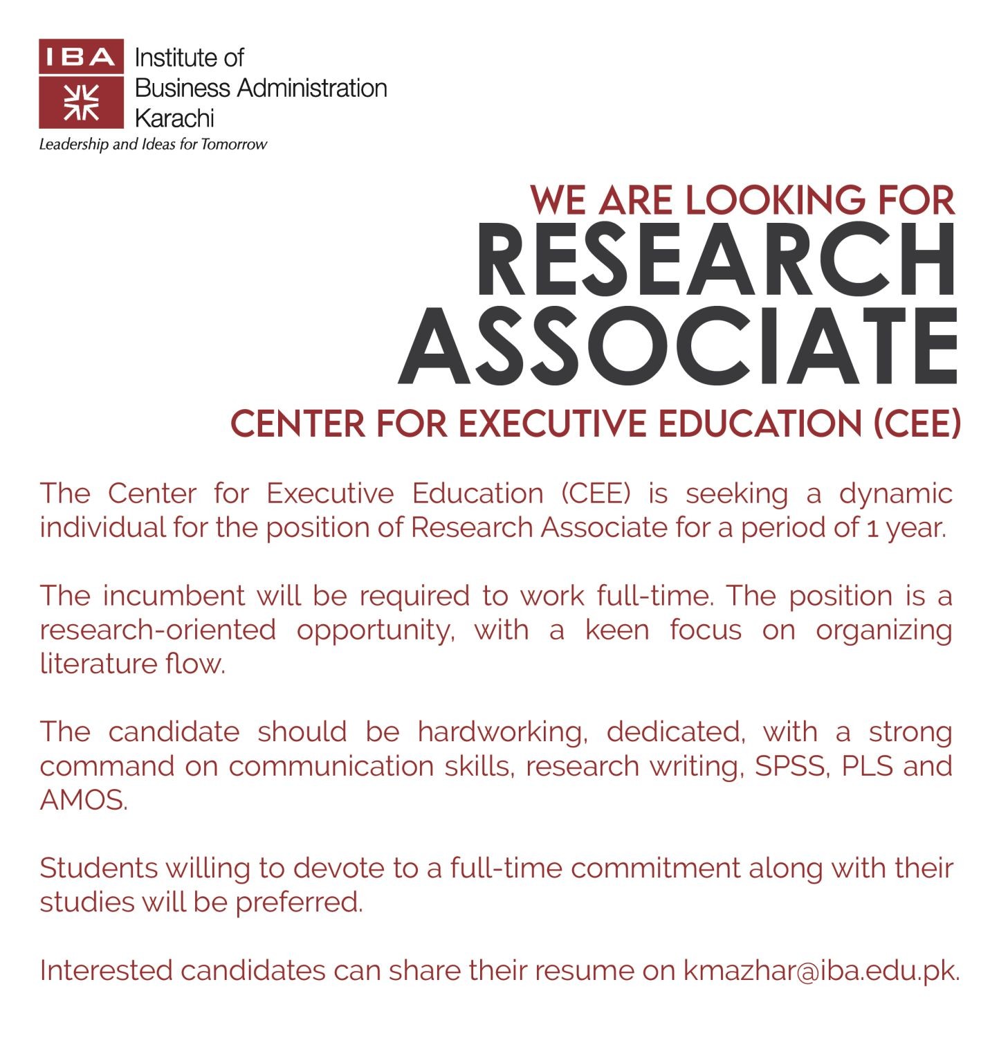 Interested candidates can share their resumes on kmazhar©iba.Edu.pk.