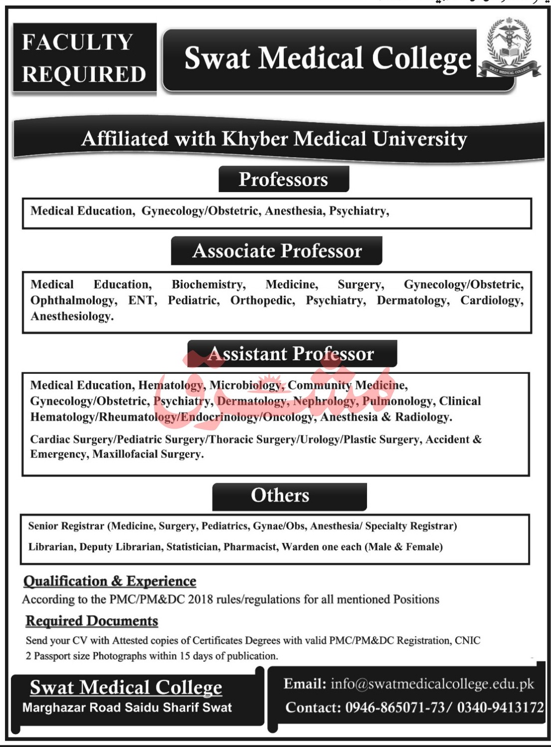 Senior Registrar (Medicine, Surgery, Pediatrics, Gynae/Obs, Anesthesia/ Specialty Registrar) Librarian, Deputy Librarian, Statistician, Pharmacist, Warden one each (Male & Female)