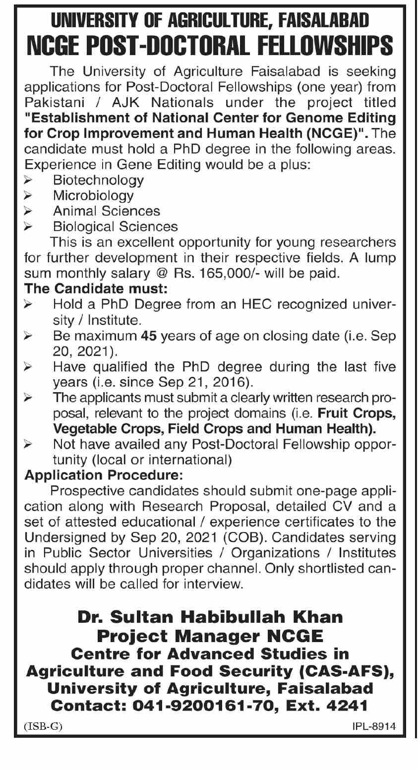 Biological Sciences This is an excellent opportunity for young researchers for further development in their respective fields. A lump sum monthly salary @ Rs. 165.0001- will be paid. The Candidate must: Hold a PhD Degree from an HEC recognized university / Institute. Be maximum 45 years of age on the closing date (i.e. Sep 20, 2021). Have qualified for the Ph.D. degree during the last five years (i.e. since Sep 21, 2016). The applicants must submit a clearly written research proposal, relevant to the project domains (i.e. Fruit Crops, Vegetable Crops, Field Crops, and Human Health). Not have availed any Post-Doctoral Fellowship opportunity (local or international) Application Procedure: Prospective candidates should submit a one-page application along with Research Proposal, a detailed CV, and a set of attested educational / experience certificates to the Undersigned by Sep 20, 2021 (COB). Candidates serving in Public Sector Universities / Organizations / Institutes should apply through proper channels. Only shortlisted candidates will be called for an interview.