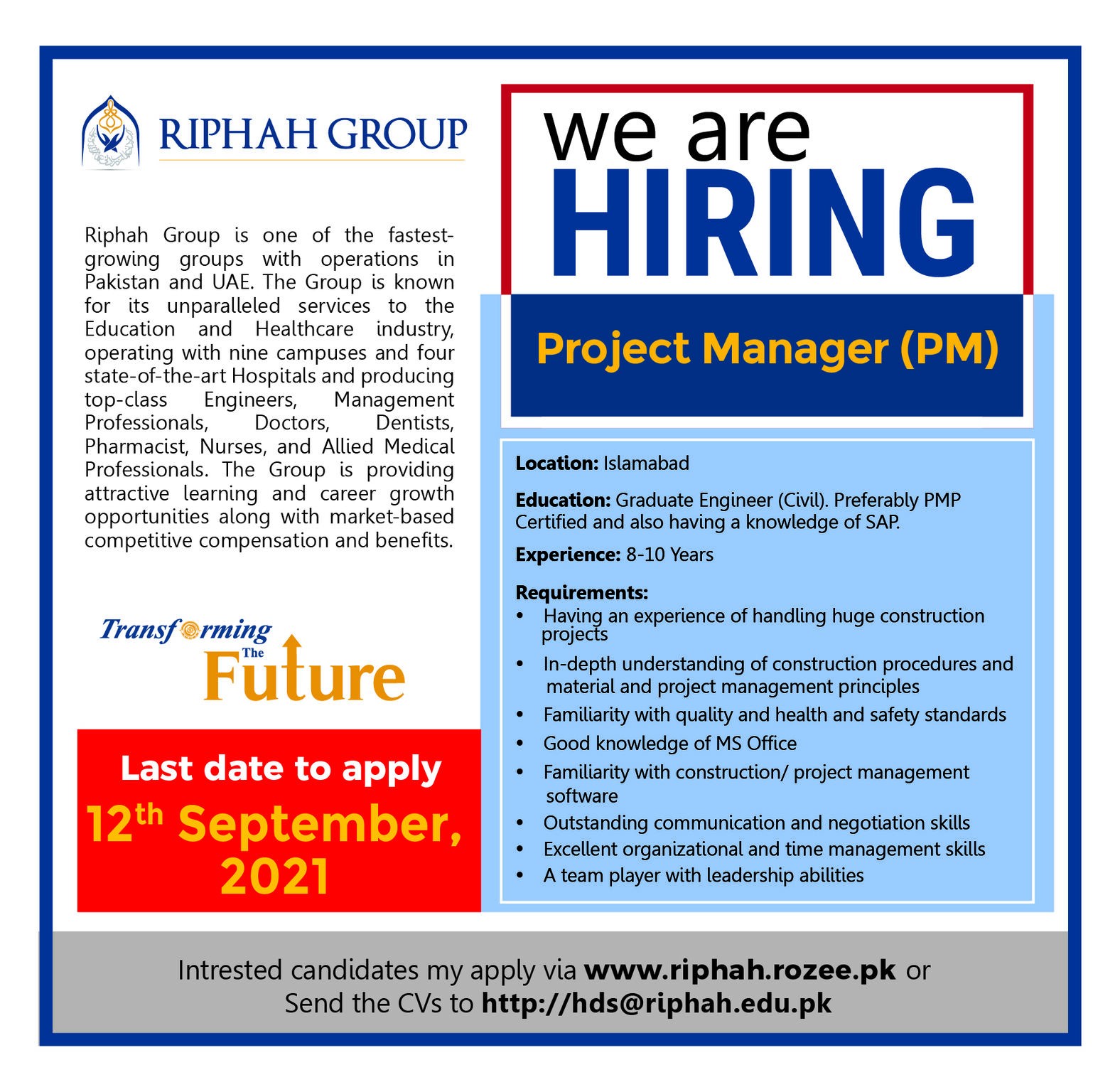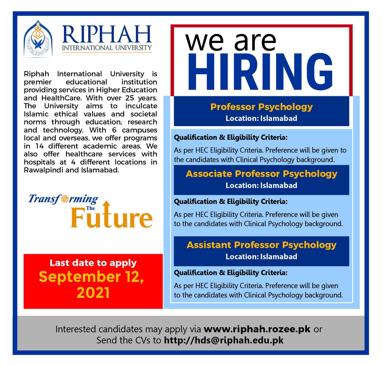 Interested candidates may apply via www.riphah.rozee.pk or Send the CVs to http://hds@riphah.edu.pk