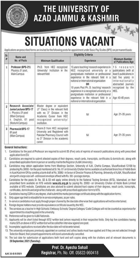 The University of Azad Jammu & Kashmir Jobs, Teaching/Faculty & Management Positions September 2021