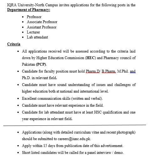 IQRA University-North Campus invites applications for the following posts in the Department of Pharmacy: