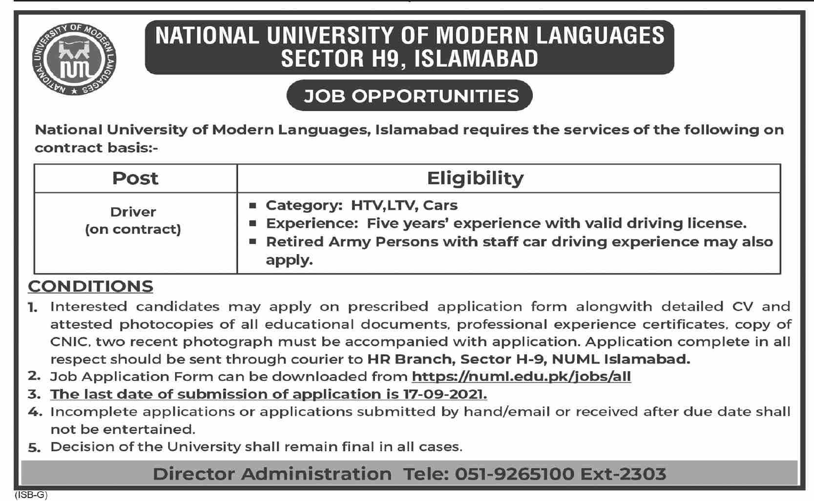 1. Interested candidates may apply on prescribed application form alongwith detailed CV and attested photocopies of all educational documents, professional experience certificates, copy of CNIC, two recent photograph must be accompanied with application. Application complete in all respect should be sent through courier to HP Branch, Sector H-9, NUML Islamabad.