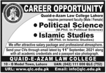 Quaid-e-Azam Law College Jobs, Teaching/Faculty Positions September 2021