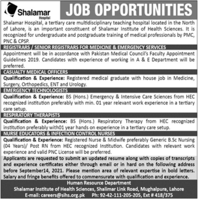 Human Resource Department Shalamar Institute of Health Sciences, Shalimar Link Road, Mughalpura, Lahore E-mail• careers@sihs.org,pk Ph: 9242-111.2054205, Ext U 418/375