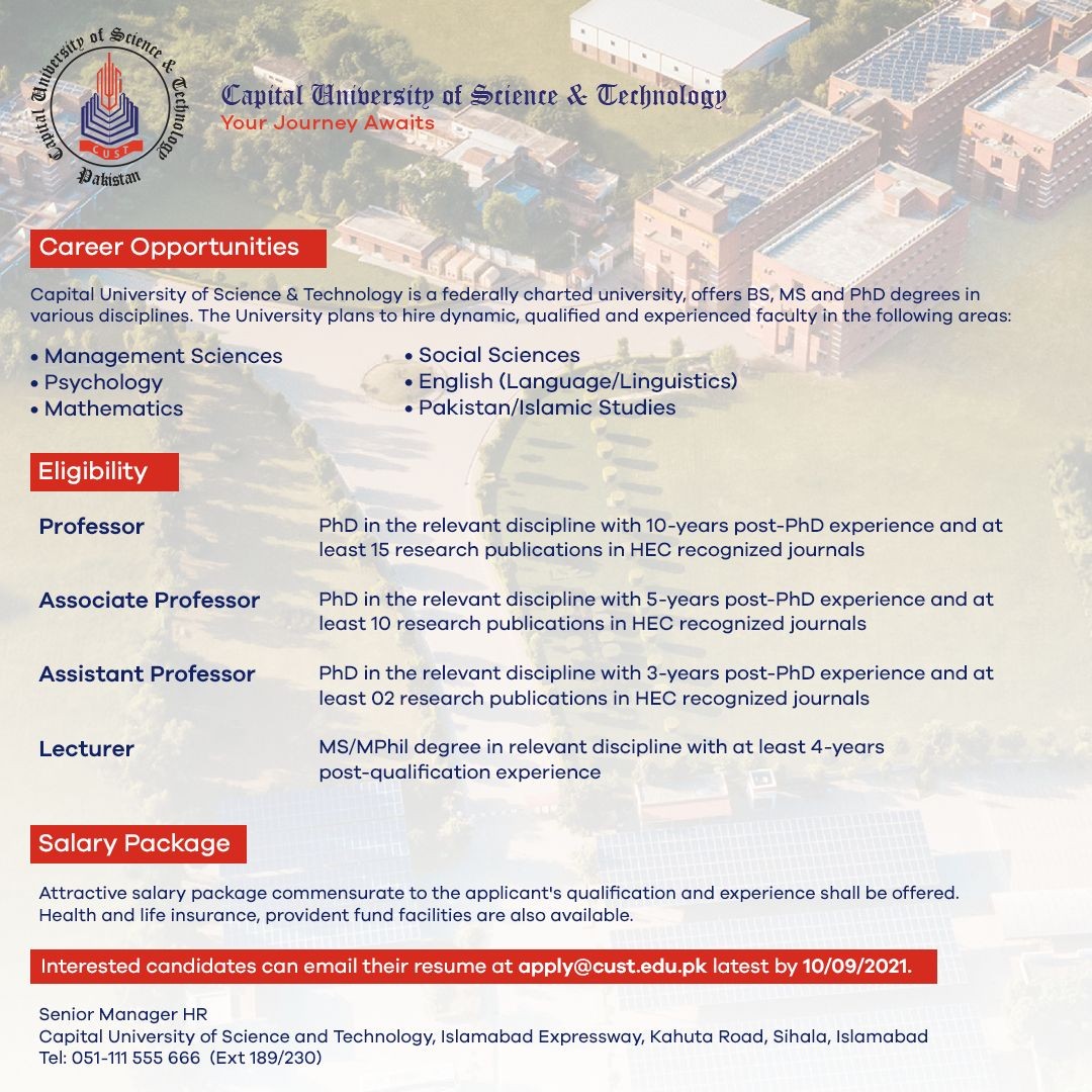 Interested candidates can email their resume at apply@cust.edu.pk latest by 10.09.2021
