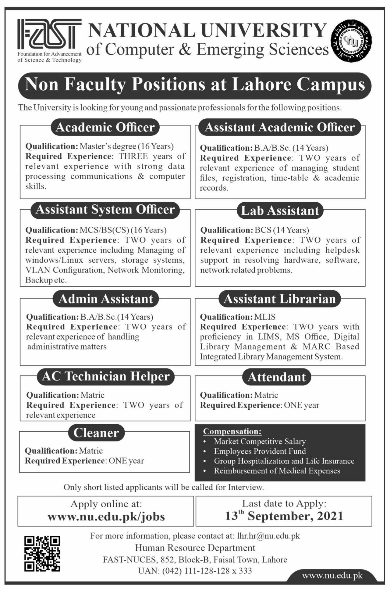 For more information, please contact at: lhr.hr@nu.edu.pk Human Resource Department FAST-NUCES, 852, Block-B, Faisal Town, Lahore UAN: (042) 111-128-128