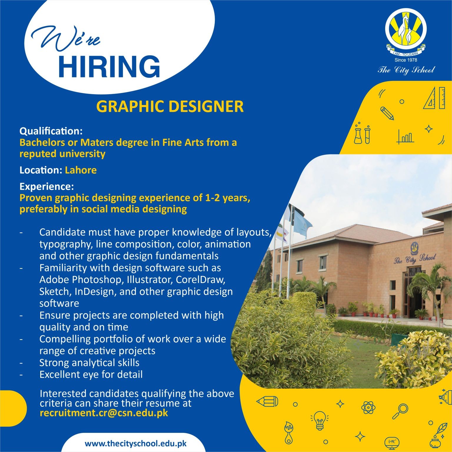 Qualification: Bachelors or Maters degree in Fine Arts from a reputed university Location: Lahore Experience: Proven graphic designing experience of 1-2 years, preferably in social media designing