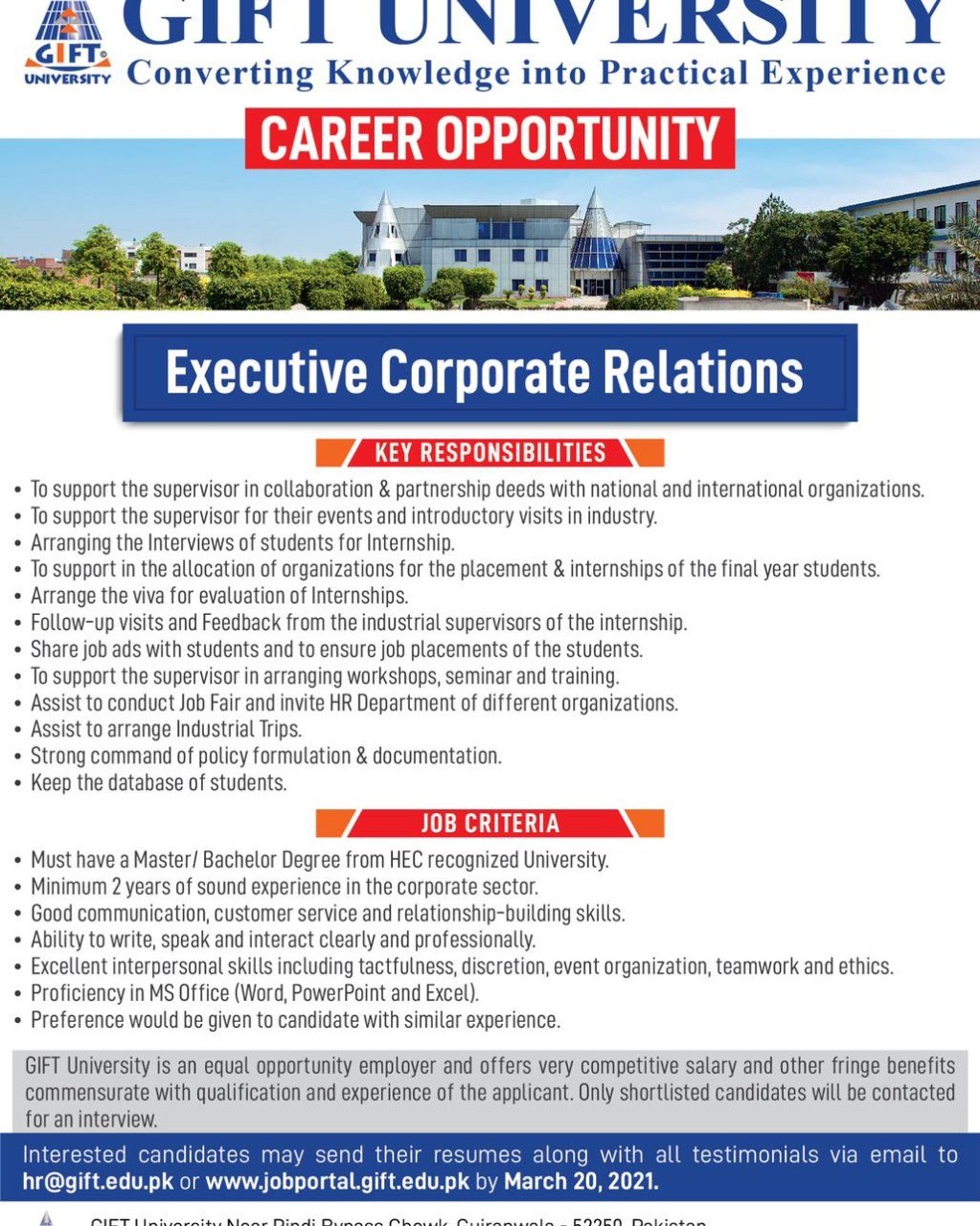 - Minimum 2 years of sound experience in corporate sector preferably experienced in Public Relations or HR.