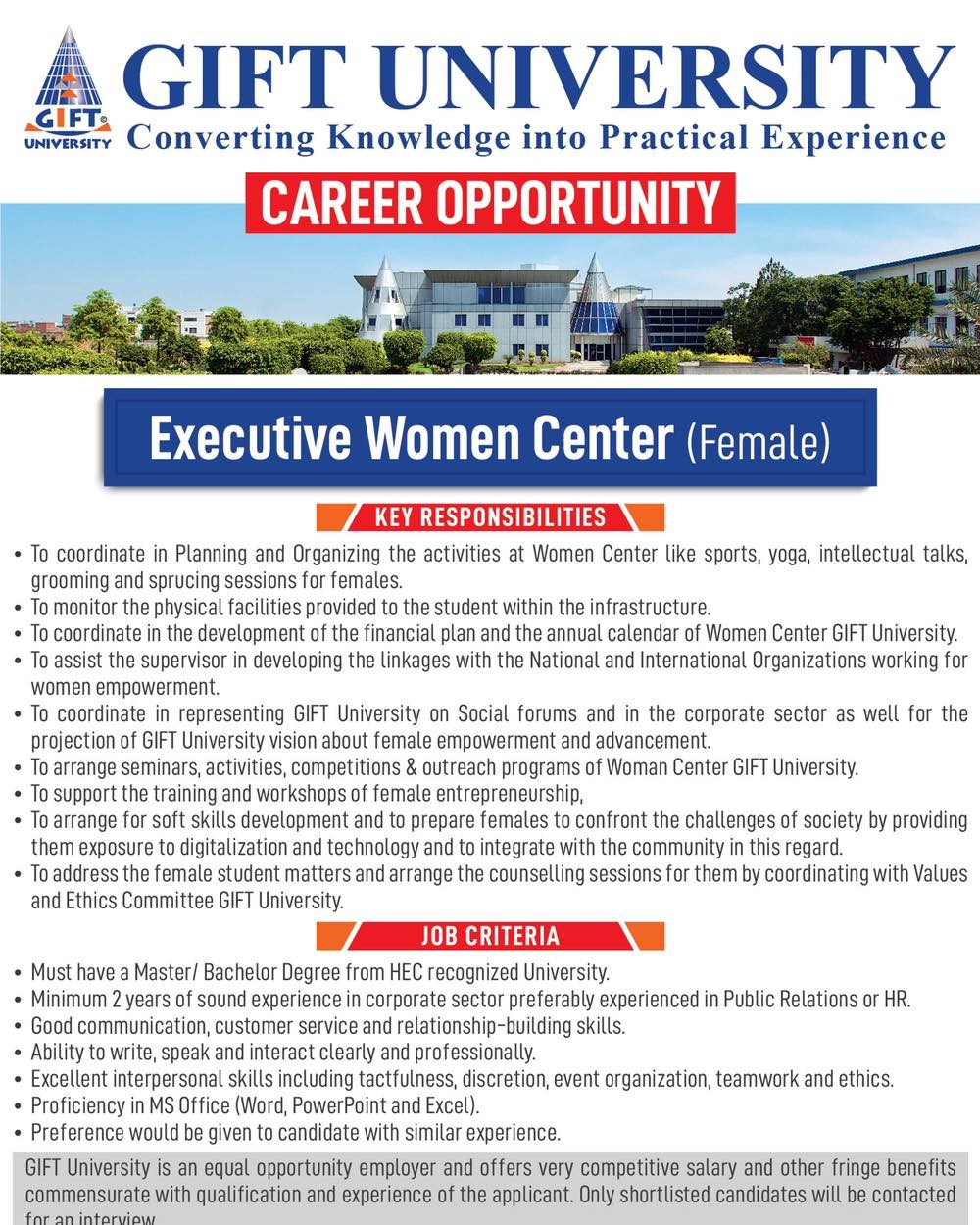 - To arrange seminars, activities, competitions & outreach programs of Woman Center GIFT University.
