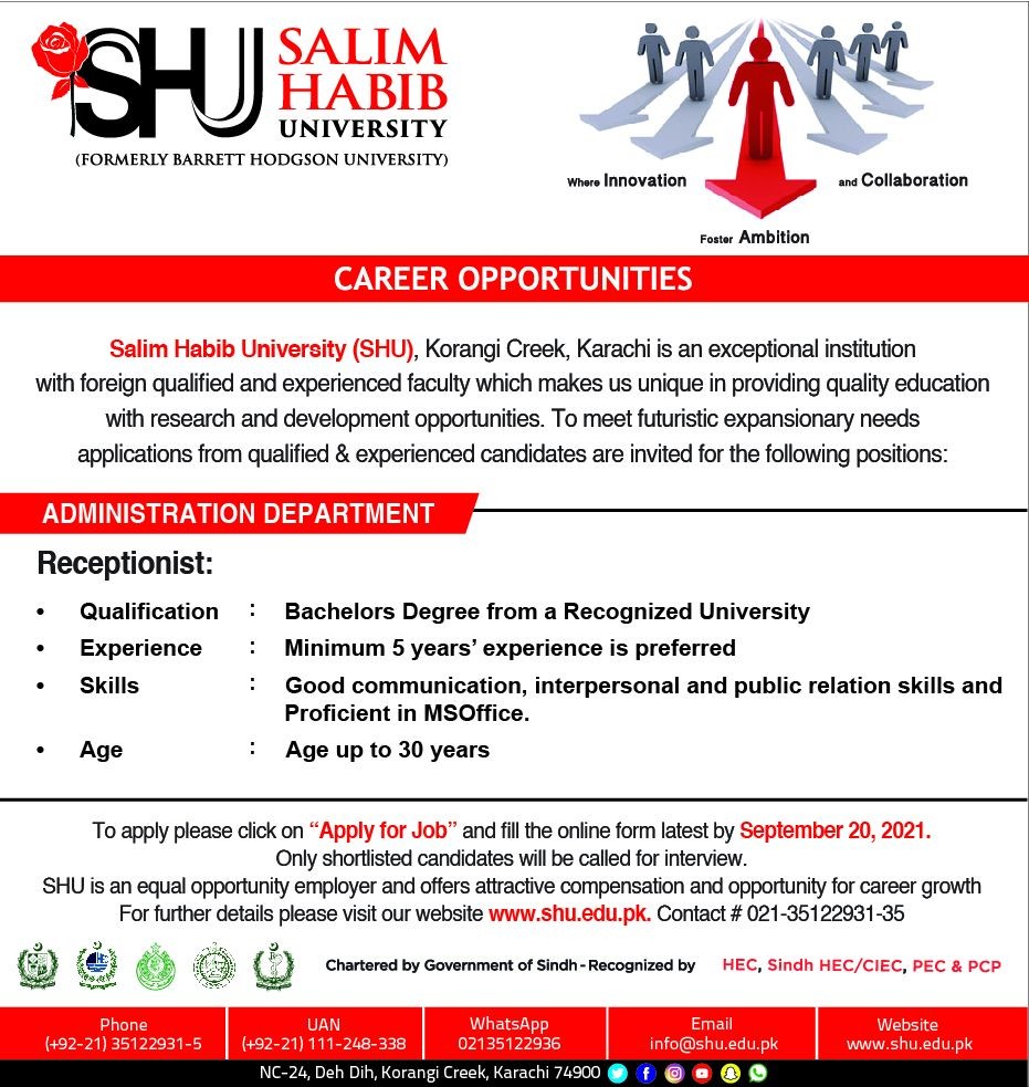 To apply please click on -Apply for Job" and fill the online form latest by September 20, 2021. Only shortlisted candidates will be called for interview. SHU is an equal opportunity employer and offers attractive compensation and opportunity for career growth For further details please visit our vvebsite www.shu.edu.pk. Contact # 021-35122931-35
