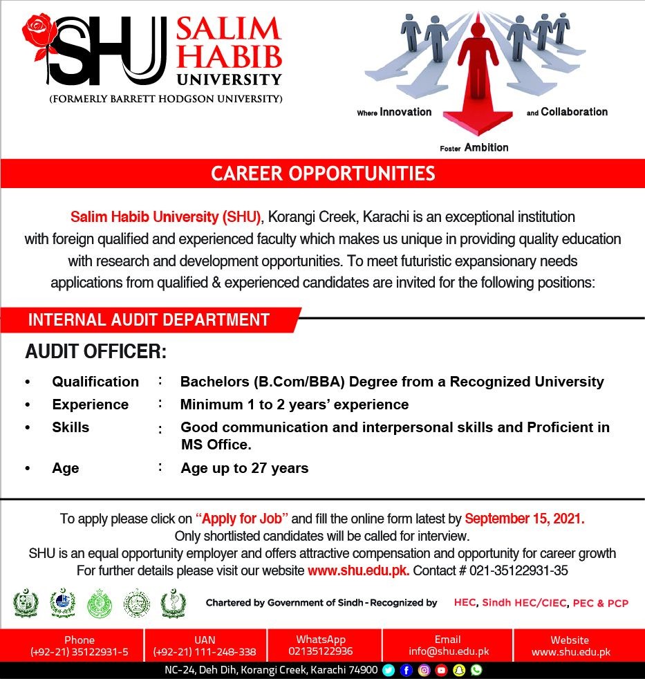 To apply please click on -Apply for Job- and fill the online form latest by September 15, 2021. Only shortlisted candidates will be called for interview. SHU is an equal opportunity employer and offers attractive compensation and opportunity for career growth For further details please visit our website www.shu.edu.pk. Contact # 021-35122931-35