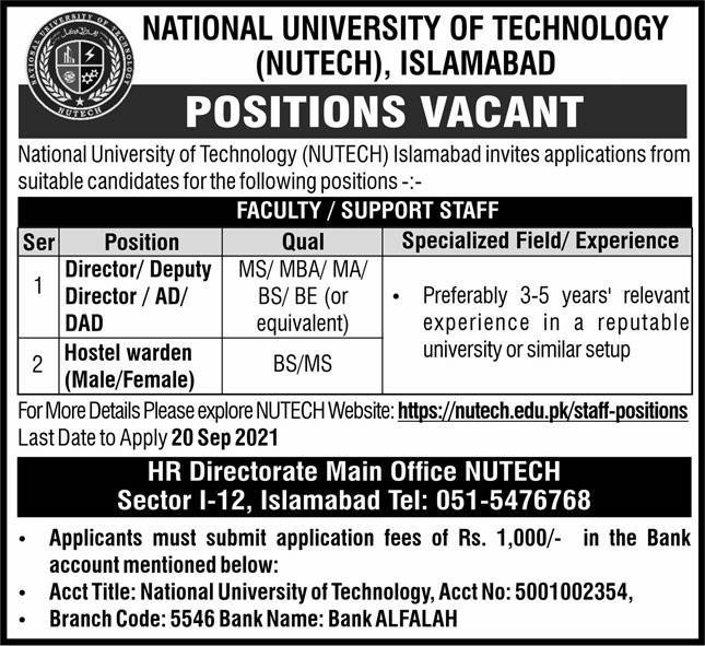 National University of Technology (NUTECH) Islamabad invites applications from suitable candidates for the following positions -:-