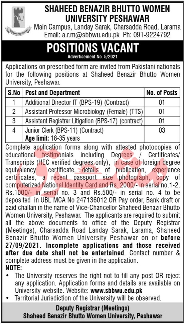 Complete application forms along with attested photocopies of educational testimonials including Degrees / Certificates/ Transcripts (HEC verified degrees only), in case of foreign degree equivalency certificate, details of publication, experience certificates, a recent passport size photograph, copy of computerized National Identity Card and Rs. 2000/- in serial no.1-2, Rs.1000/- in serial no. 3 and Rs.500/- in serial no. 4 to be deposited in UBL MCA No 247136012 OR Pay order, Bank draft or paid challan in the name of Vice-Chancellor Shaheed Benazir Bhutto Women University, Peshawar. The applicants are required to submit all the above documents to office of the Deputy Registrar (Meetings), Charsadda Road Landay Sarak, Larama, Shaheed Benazir Bhutto Women University Peshawar on or before 27/09/2021. Incomplete applications and those received after due date shall not be entertained. Contact number & complete address must be given in the application. NOTE: • The University reserves the right not to fill any post OR reject any application. Application forms and details are available on University website. Website: www.sbbwu.edu.pk • Territorial Jurisdiction of the University will be observed. Deputy Registrar (Meetings) Shaheed Benazir Bhutto Women University. Peshawar