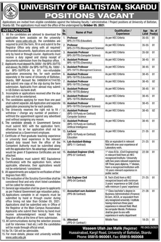 University of Baltistan Skardu Jobs, Teaching/Faculty & Management Positions September 2021