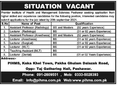 Heath and ManagOrriet Sciences Peshawar 8001Ong Opp: Cation from higher Moiled and experience Gann dated for the following post. Interested candidates may subrne applications for the job most by 20 September 2021.