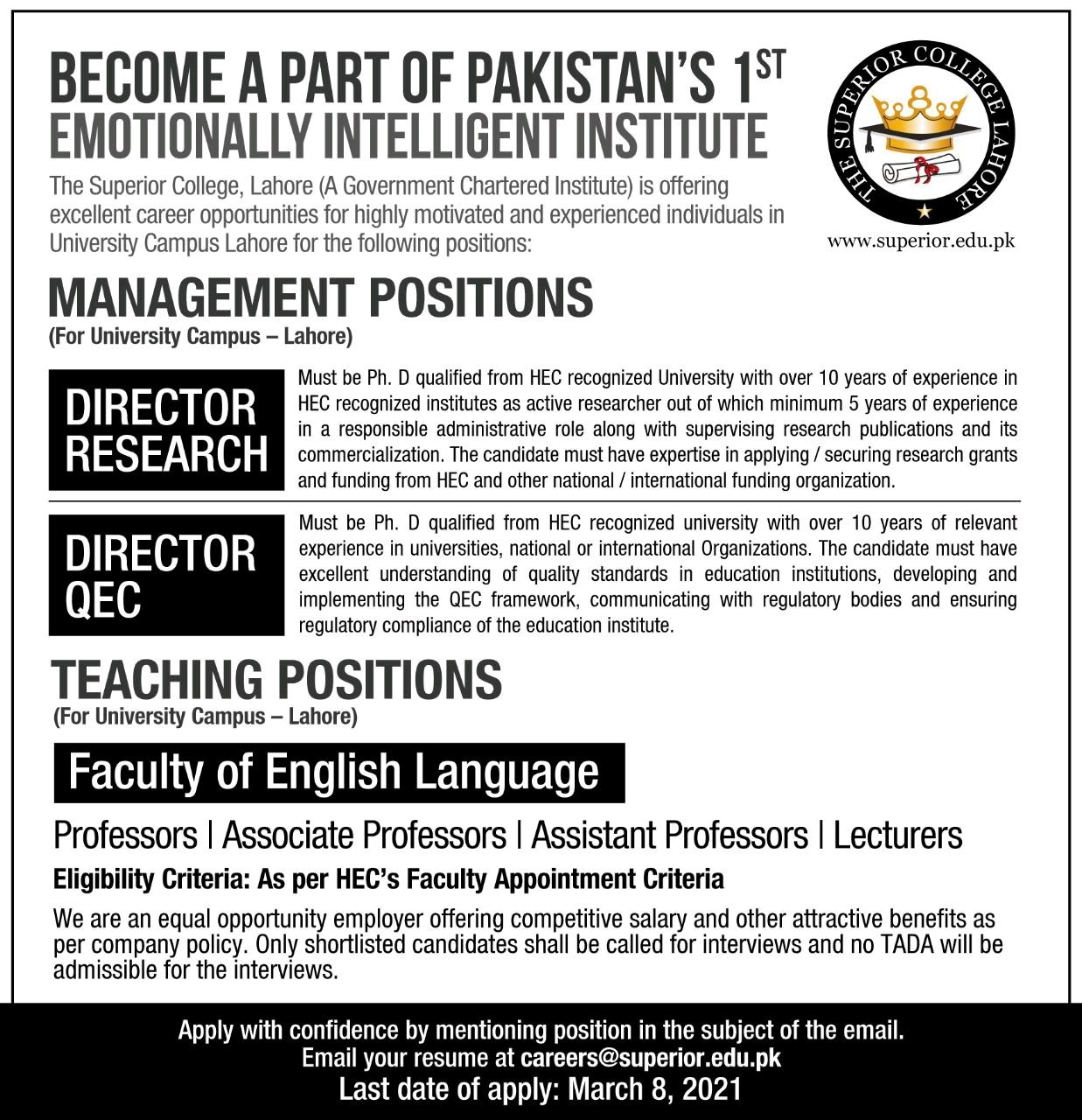 EduJobs Pakistan is an independent platform dedicated to providing information about education sector job opportunities in Pakistan, sourced from prominent newspapers and official institution channels. Our goal is to assist job seekers nationwide by delivering timely updates on available positions. As a precaution, refrain from making any payments if an employer requests fees for activities such as shortlisting or interviews. Ensure that you apply according to the instructions and dates specified in the original job advertisement. EduJobs Pakistan is not liable for inaccuracies or misrepresentations in job ads. If you have any uncertainties, we recommend visiting the institution’s official website or contacting them through their official contact numbers for verification. Please note, EduJobs Pakistan operates independently and is not affiliated with any government entity.