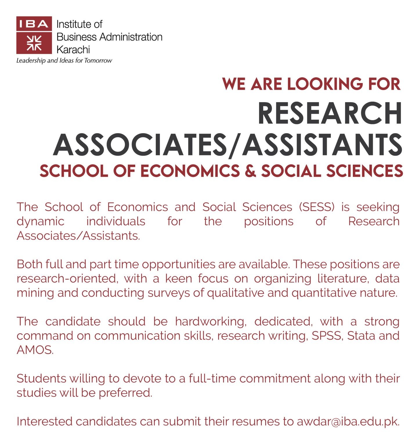 Interested candidates can submit their resumes to awdar©iba.edu.pk.