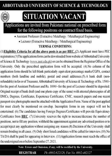 AUST – Abbottabad Universityof Science & Technology Jobs, Teaching/Faculty Positions September 2021