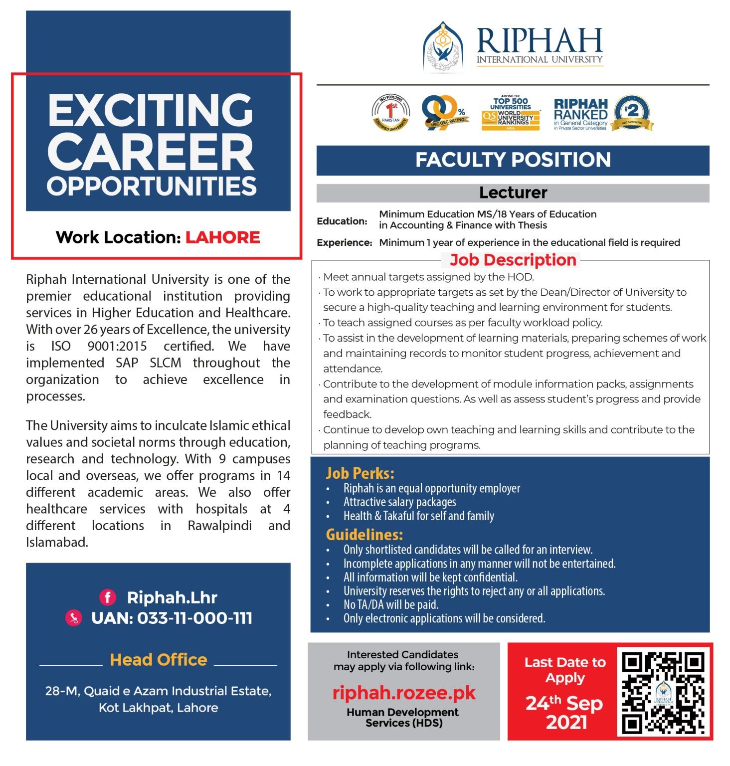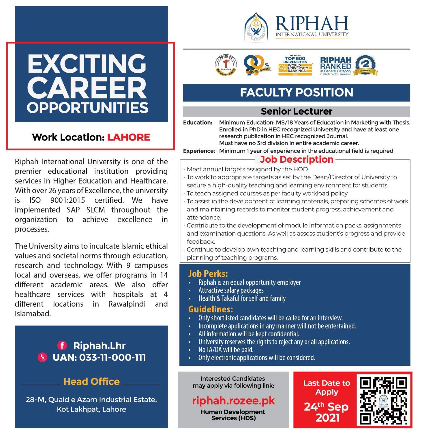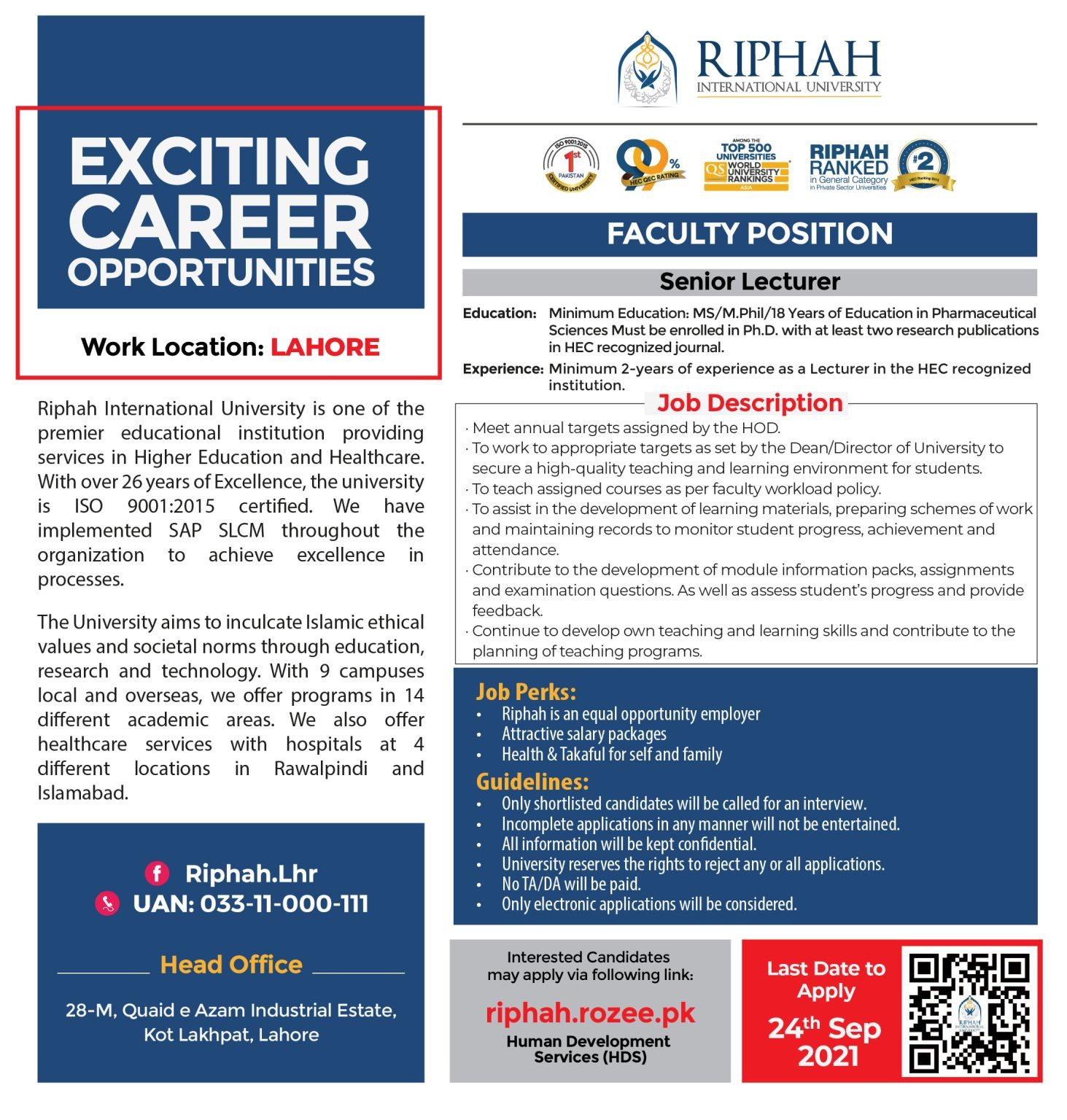 Job Perks: • Riphah is an equal opportunity employer • Attractive salary packages • Health & Takaful for self and family Guidelines: • Only shortlisted candidates will be called for an interview. • Incomplete applications in any manner will not be entertained. • All information will be kept confidential. • University reserves the rights to reject any or all applications. • No TA/DA will be paid. • Only electronic applications will be considered.