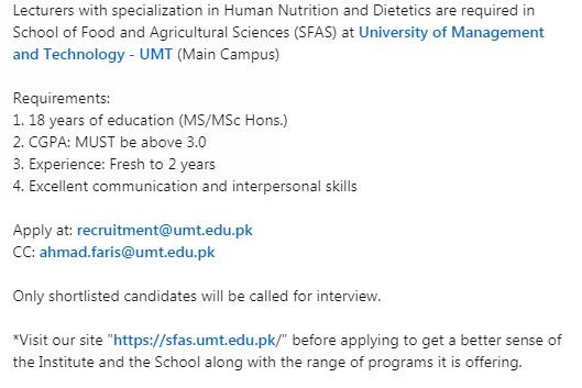 Lecturers with specialization in Human Nutrition and Dietetics are required in School of Food and Agricultural Sciences (SFAS) at University of Management and Technology - UMT (Main Campus)