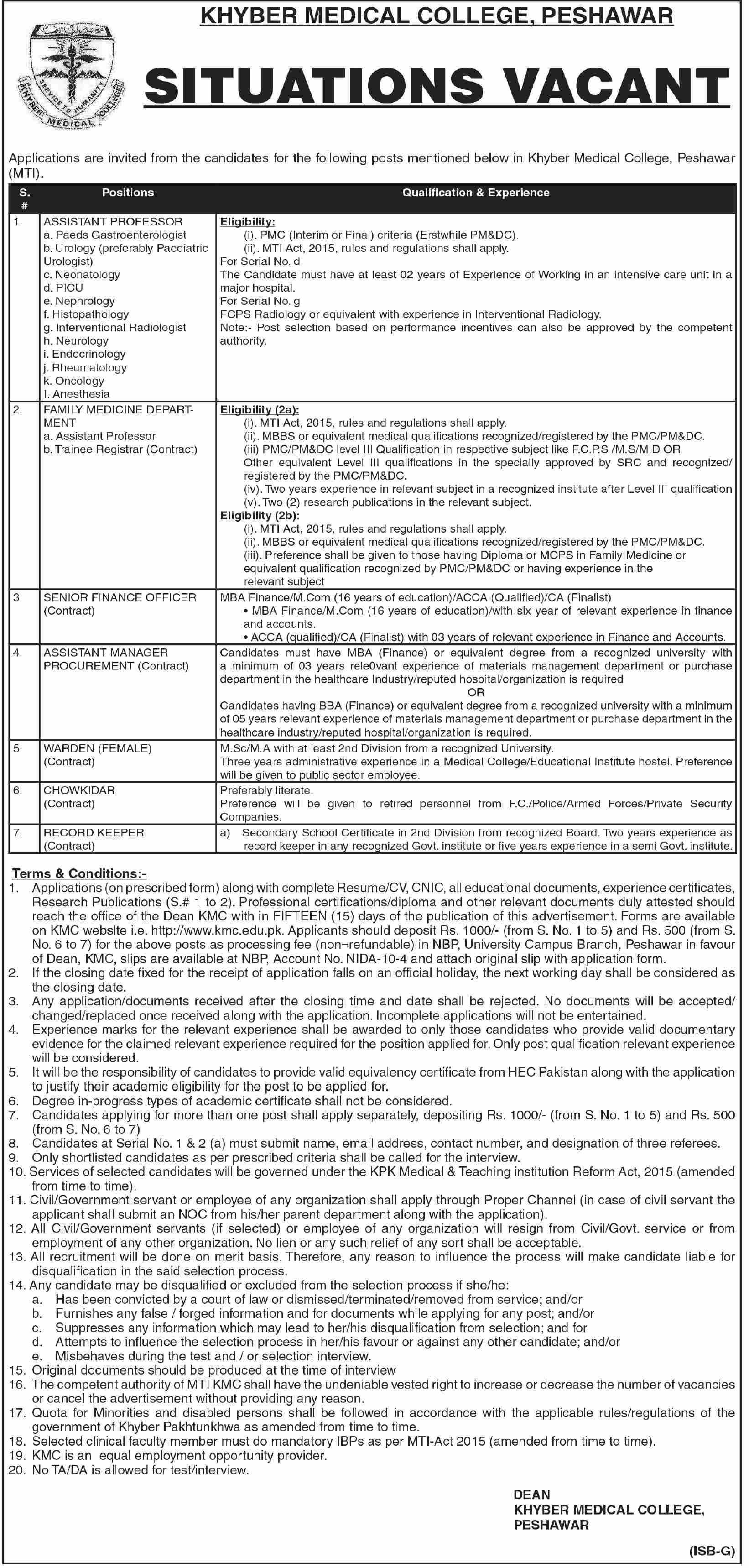 Teaching/Faculty & Management, Khyber Medical college Peshawar Jobs September 2021