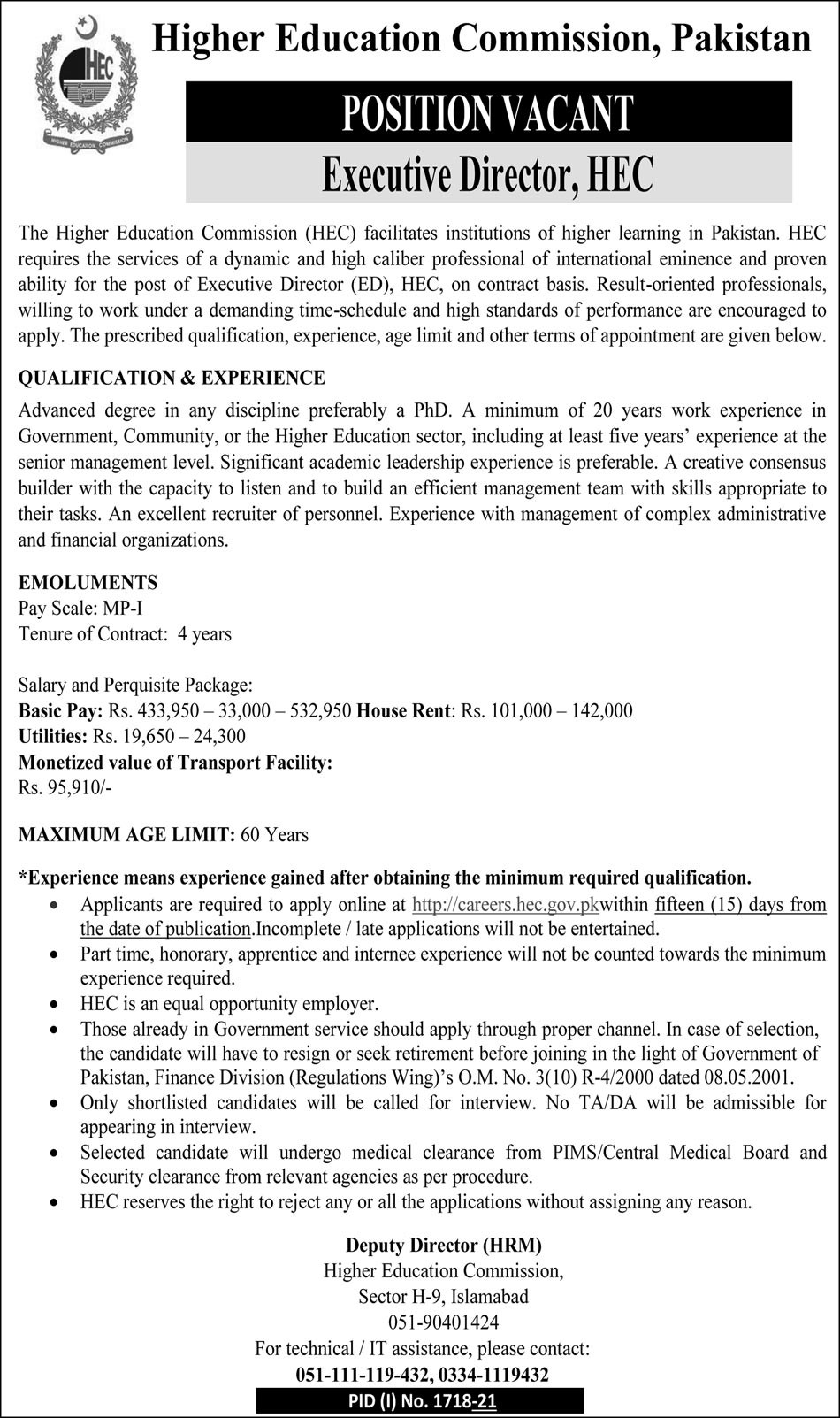 The Higher Education Commission (HEC) facilitates institutions of higher learning in Pakistan. HEC requires the services of a dynamic and high caliber professional of international eminence and proven ability for the post of Executive Director (ED), HEC, on contract basis. Result-oriented professionals, willing to work under a demanding time-schedule and high standards of performance are encouraged to apply. The prescribed qualification, experience, age limit and other terms of appointment are given below.