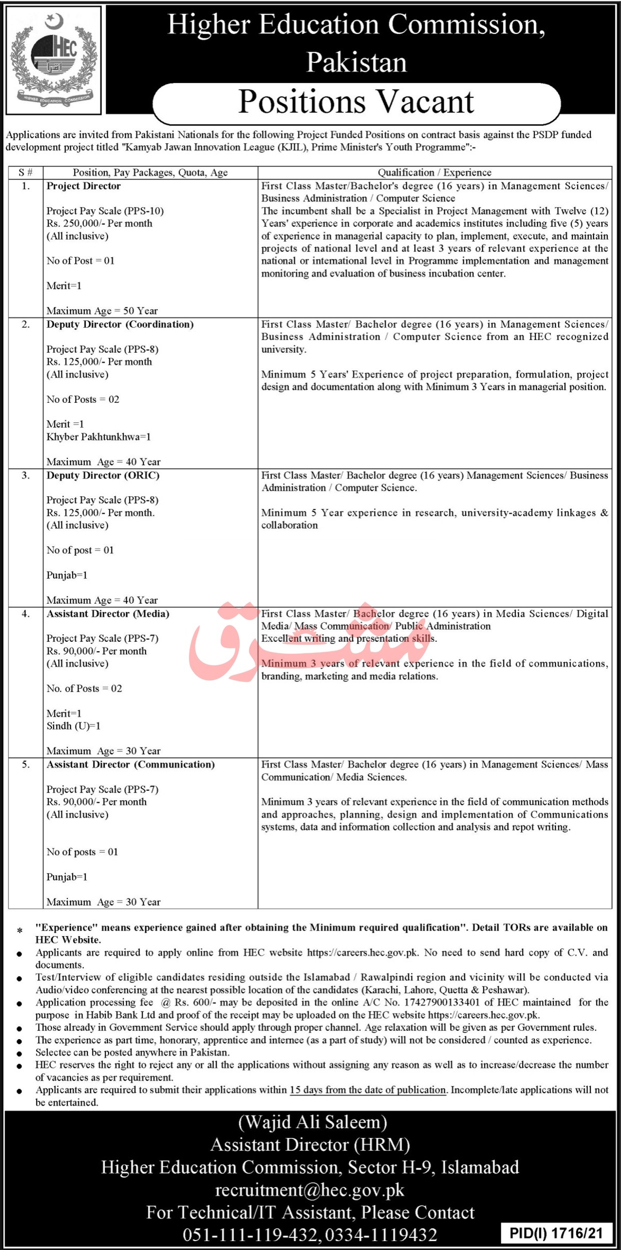Deputy Director (HRM) Higher Education Commission, Sector H-9, Islamabad 051-90401424 For technical / IT assistance, please contact: 051-111-119-432, 0334-1119432