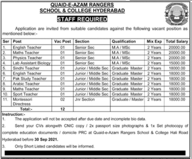 Teaching/Faculty Positions, Quaid e Azam Rangers Public School and College Jobs September 2021