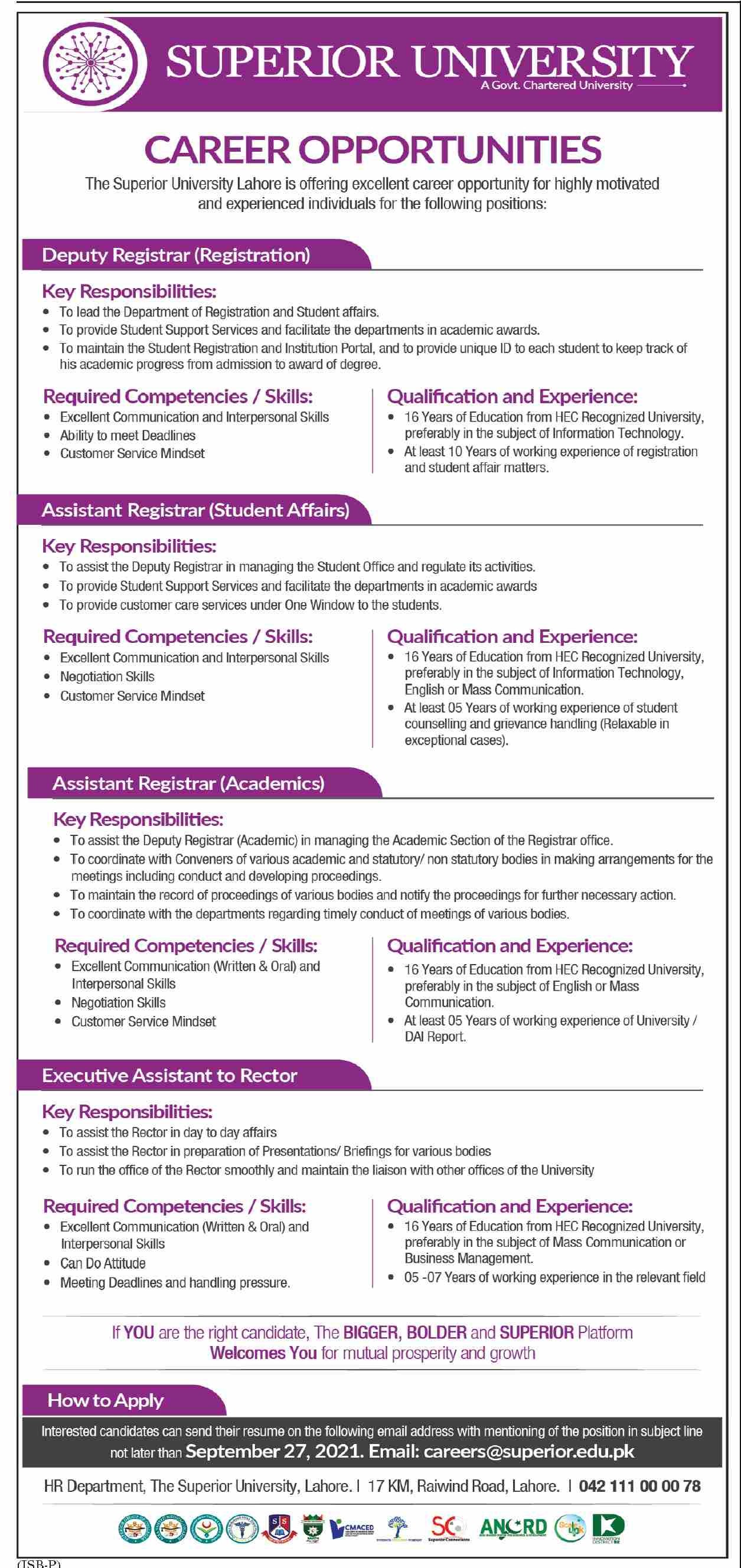 Interested candidates can send Their resume on the following email address with mentioning of the position in subject line not later than September 27, 2021. Email: careers@superior.edu.pk