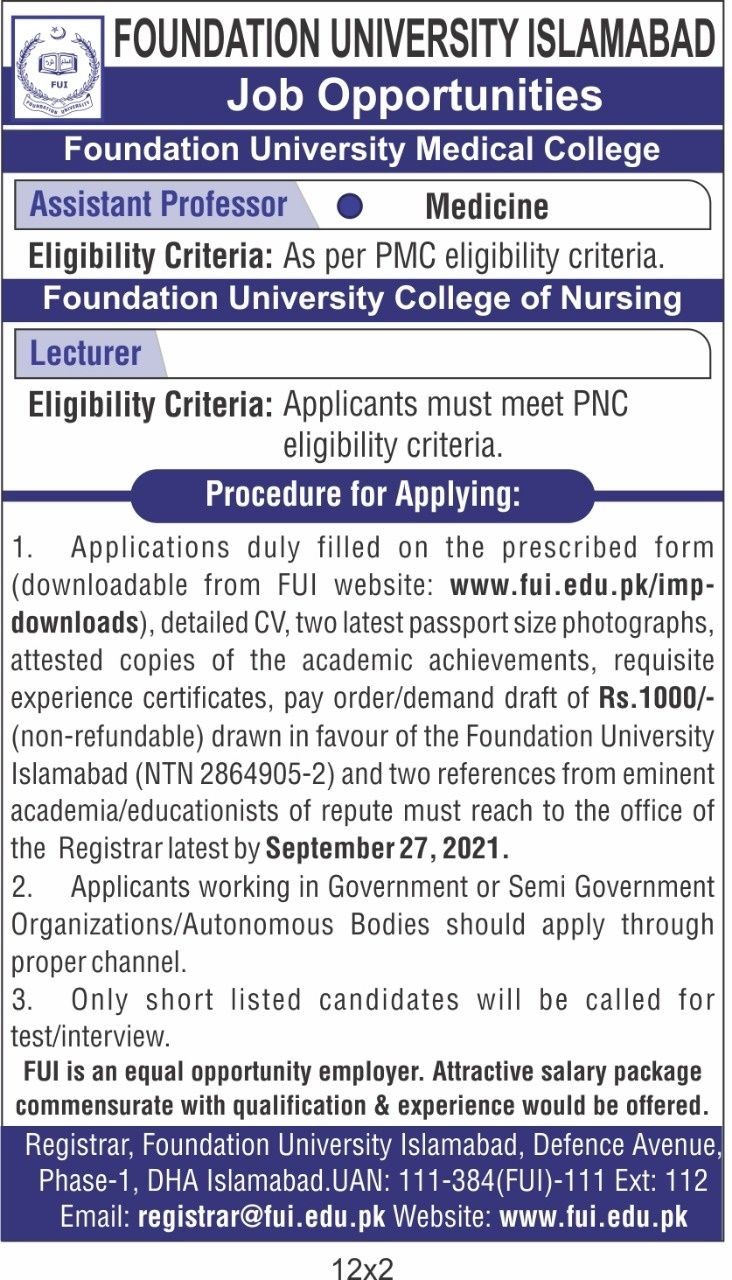 1. Applications duly filled on the prescribed form (downloadable from FUI website: www.fui.edu.pk/imp-downloads), detailed CV, two latest passport size photographs, attested copies of the academic achievements, requisite experience certificates, pay order/demand draft of Rs.1000/- (non-refundable) drawn in favour of the Foundation University Islamabad (NTN 2864905-2) and two references from eminent academia/educationists of repute must reach to the office of the Registrar latest by September 27,2021.