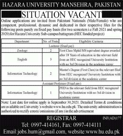 Teaching/Faculty Positions, Hazara University Mansehra Jobs September 2021