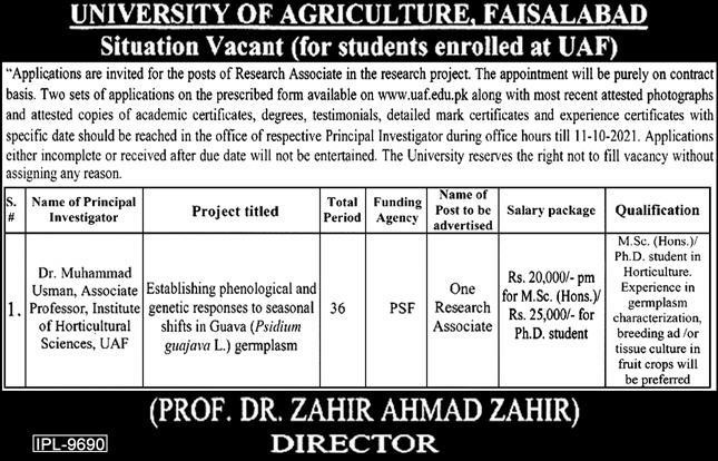 "Applications ate invited for the posts of Research Associate in the research project. The appointment will be purely on contract basis. Two sets of applications on the prescribed form available on www.uaf.edu.pk along with most recent attested photographs and attested copies of academic certificates, degrees, testimonials, detailed mark certificates and experience certificates with specific date should be reached in the office of respective Principal Investigator during office hours till 11-10-2021. Applications either incomplete or received after due date will not be entertained. The University reserves the right not to fill vacancies without ass' ning any reason.