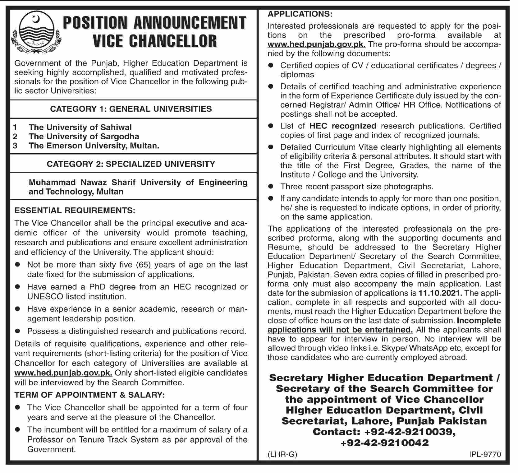 Government of the Punjab, Higher Education Department is seeking highly accomplished: qualified and motivated professionals for the position of Vice Chancellor in the following pub-lic sector Universities:
