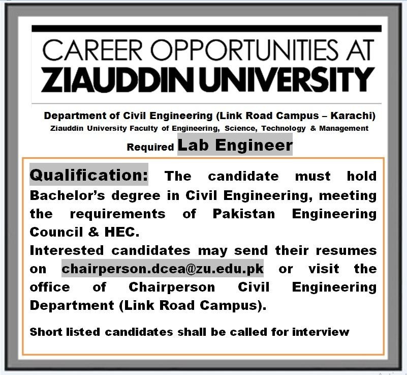 Department of Civil Engineering (Link Road Campus - Karachi) Ziauddin University Faculty of Engineering, Science, Technology & Management Required Lab Engineer