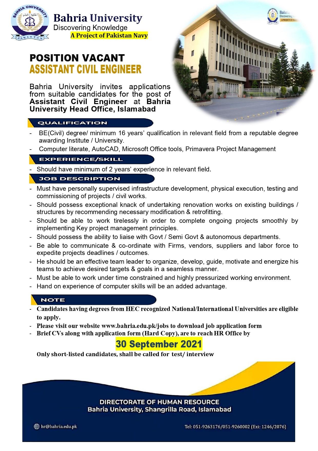 - Candidates having degrees from HEC recognized National/International Universities are eligible to apply. - Please visit our website www.bahria.edu.pk/jobs to download job application form - Brief CVs along with application form (Hard Copy), are to reach HR Office by 30 September 2021 Only short-listed candidates, shall be called for test/ interview