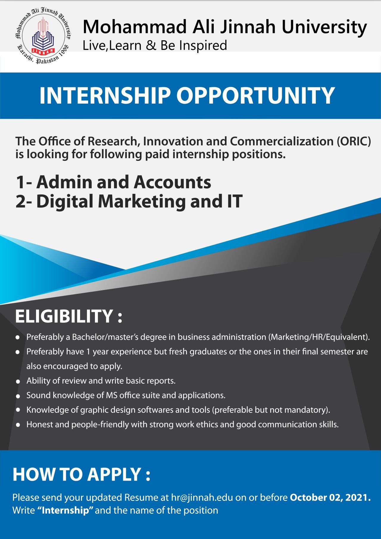 Please send your updated Resume at hr@jinnah.edu on or before October 02, 2021. Write "Internship" and the name of the position