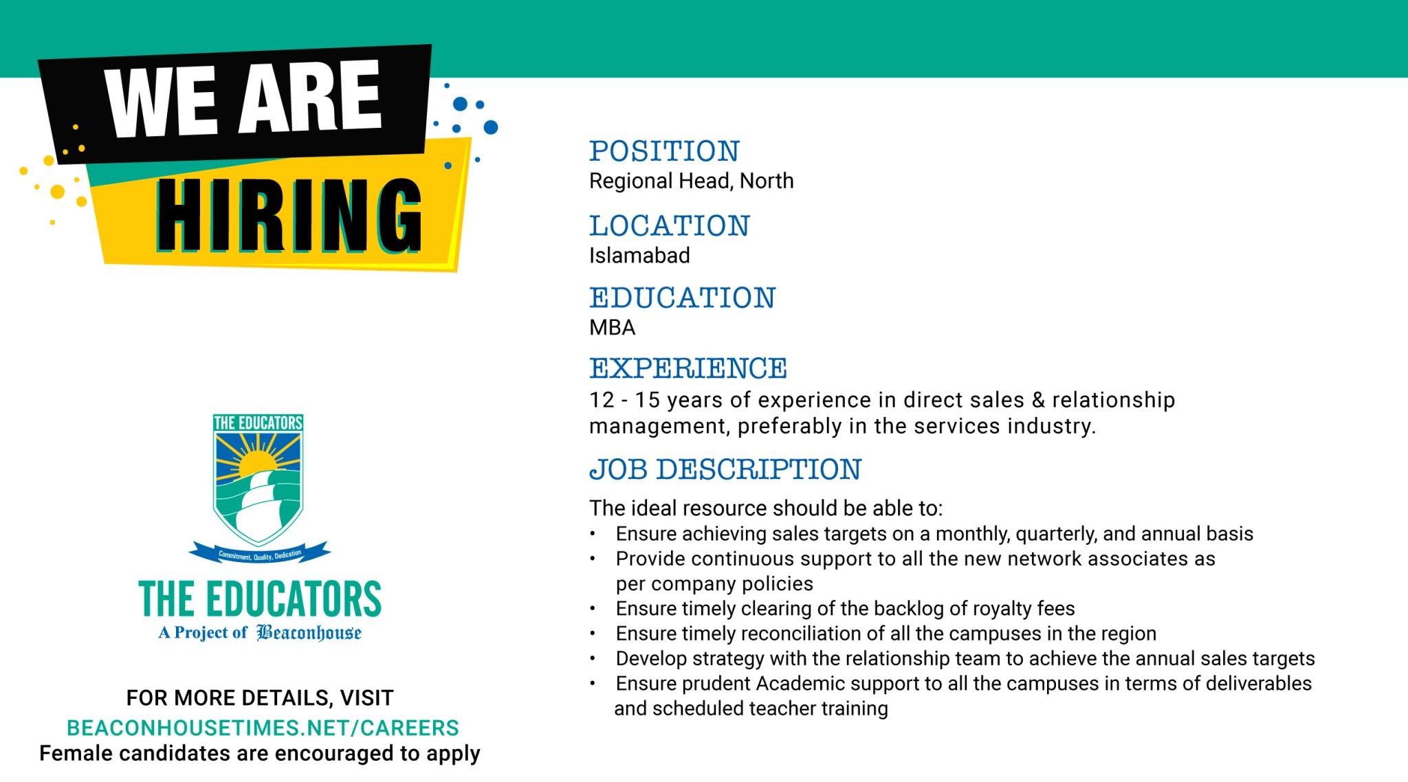 FOR MORE DETAILS, VISIT BEACON HOUSE TIMES.NET/CAREERS Female candidates are encouraged to apply
