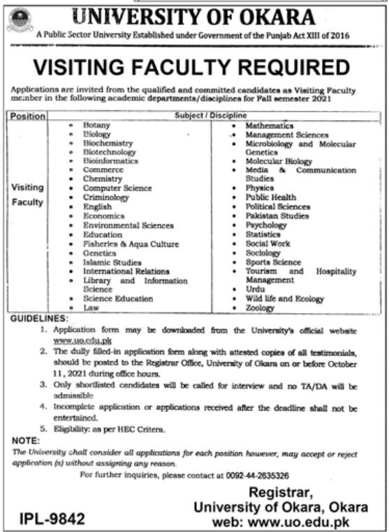 Teaching/Faculty Positions, University of Okara Jobs September 2021