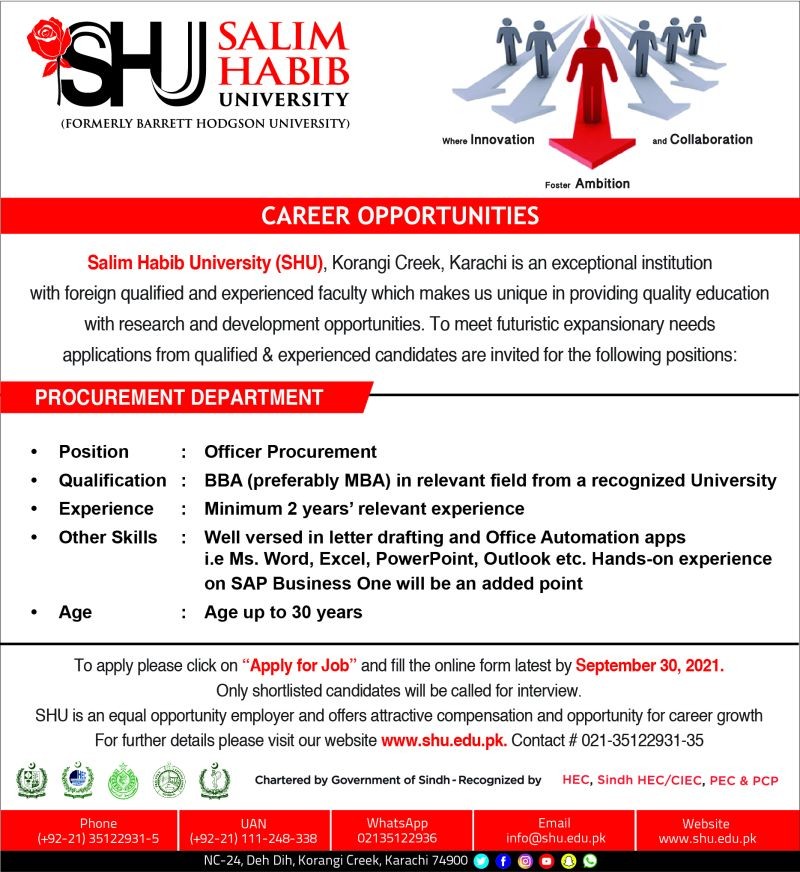 To apply please click on "Apply for Job" and fill the online form latest by September 30, 2021. Only shortlisted candidates will be called for interview. SHU is an equal opportunity employer and offers attractive compensation and opportunity for career growth For further details please visit our website www.shu.edu.pk. Contact # 021-35122931-35 ( u Chartered by Govemment of Sindh-Recognized by HEC, Sindh HEC/CIEC, PEC & PCP