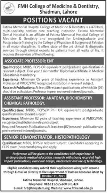 Teaching/Faculty Positions, FMH College of Medicine and Dentistry Jobs September 2021