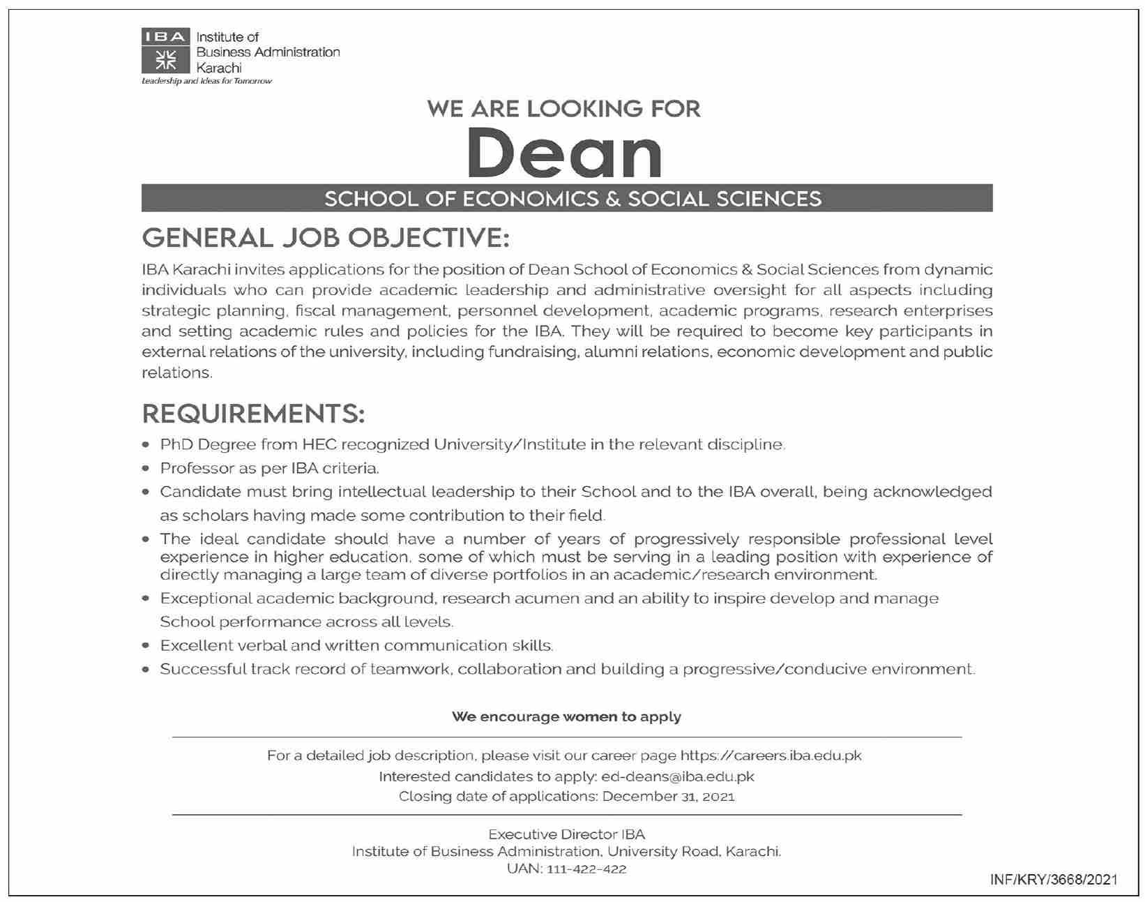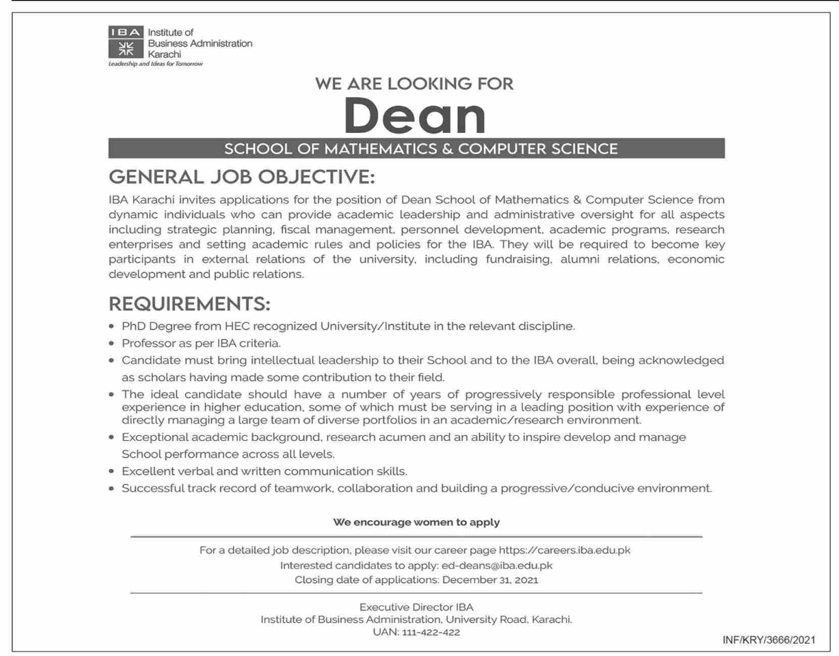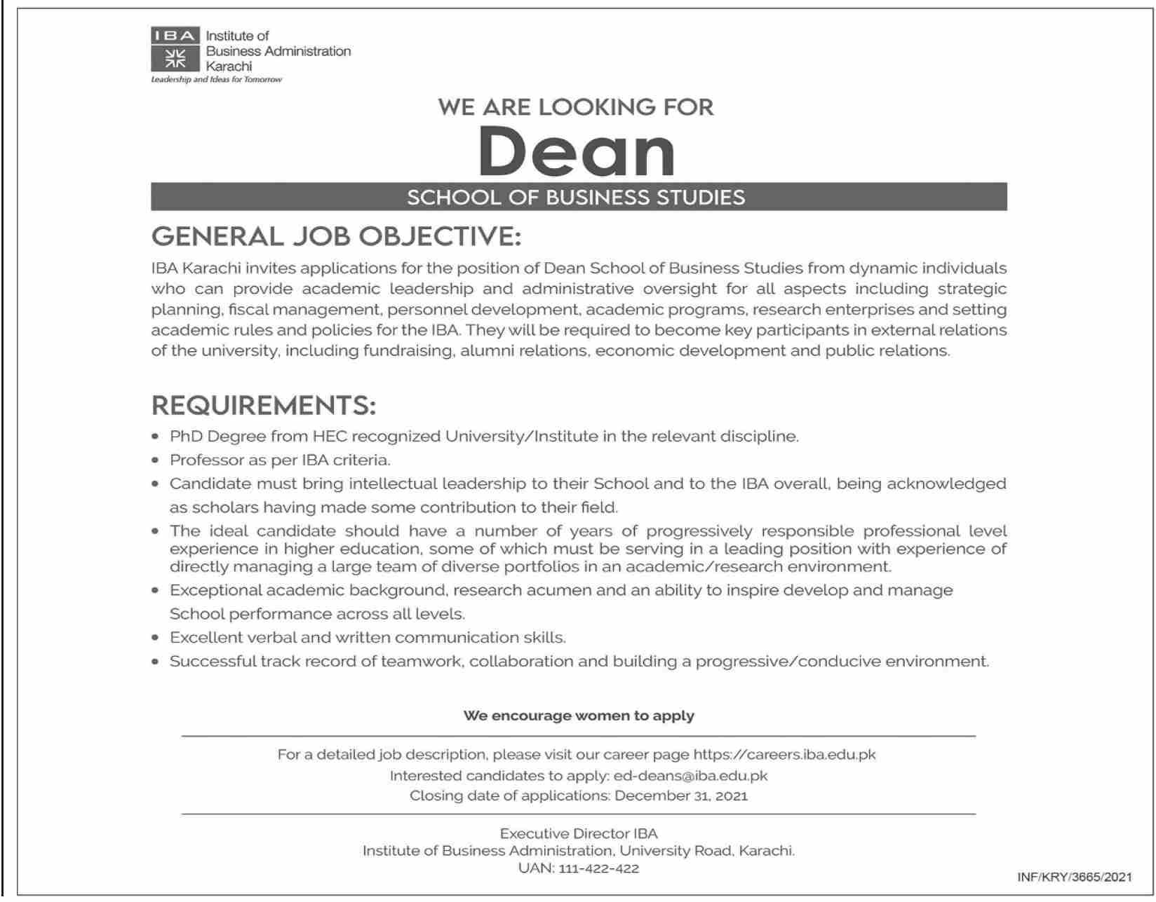For a detailed job description, please visit our career page https://careersiba.edu.pk Interested candidates to apply: ed-deans®iba.edu.pk Closing date of applications: December 31. 2021