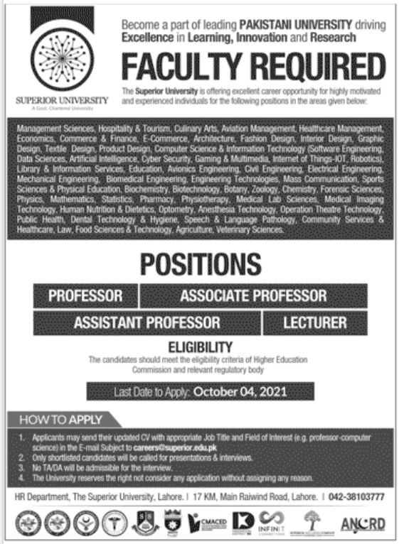 Teaching/Faculty Positions, Superior University Jobs September 2021