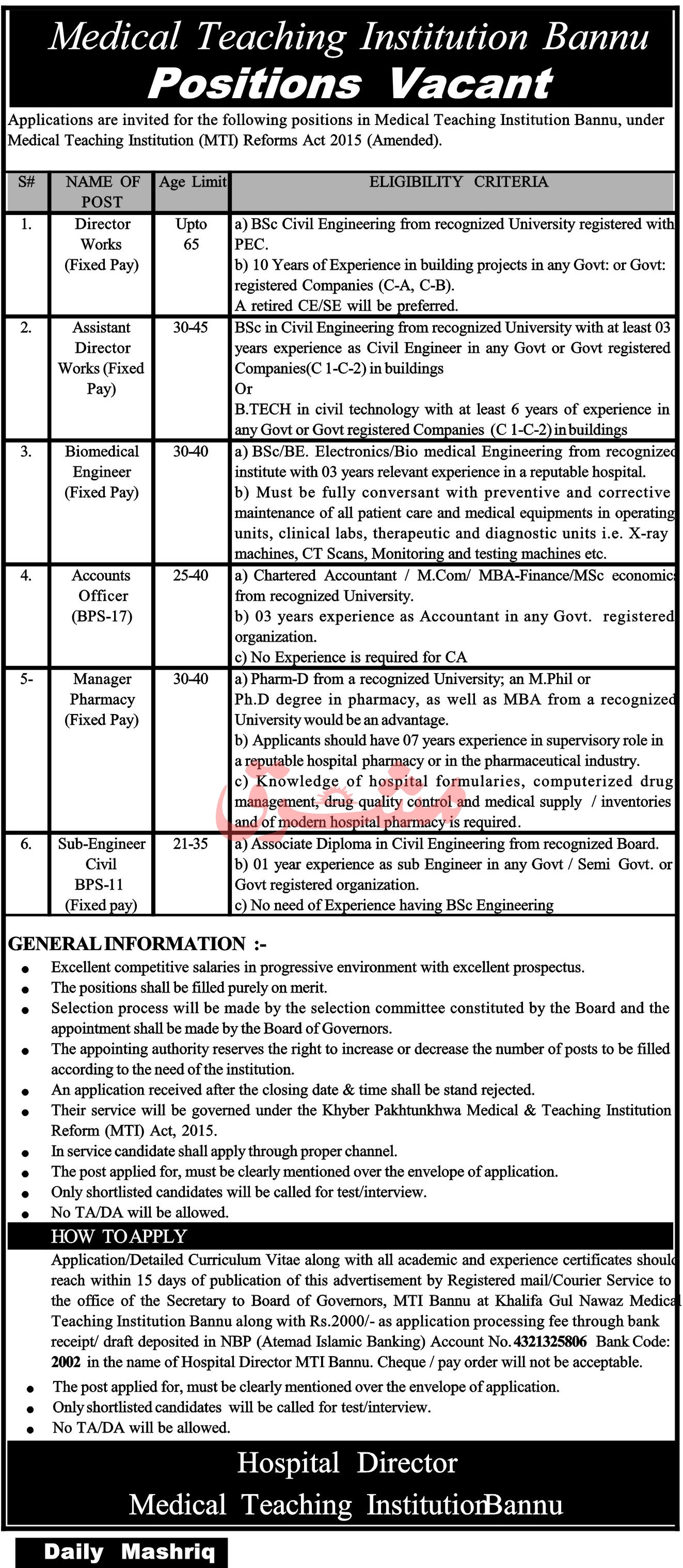 Application/Detailed Curriculum Vitae along with all academic and experience certificates shoul( reach within 15 days of publication of this advertisement by Registered mail/Courier Service to the office of the Secretary to Board of Governors, MTI Bannu at Khalifa Gul Nawaz MedicE Teaching Institution Bannu along with Rs.2000/- as application processing fee through bank receipt/ draft deposited in NBP (Atemad Islamic Banking) Account No. 4321325806 Bank Code: 2002 in the name of Hospital Director MTI Bannu. Cheque / pay order will not be acceptable. • The post applied for, must be clearly mentioned over the envelope of application. • Only shortlisted candidates will be called for test/interview. • No TA/DA will be allowed.