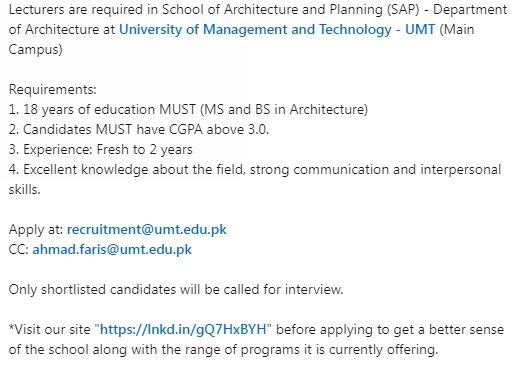 Apply at: recruitment@umt.edu.pk
