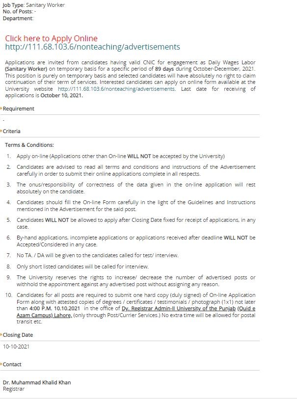 Applications are invited from candidates having valid CNIC for engagement as Daily Wages Labor (Sanitary Worker) on temporary basis for a specific period of 89 days during October-December, 2021. This position is purely on temporal)/ basis and selected candidates will have absolutely no right to claim continuation of their term of services. Interested candidates can apply on online form available at the University website http://111.68.103.6/nonteaching/advertisemenis. Last date for receiving of applications is October 10, 2021.